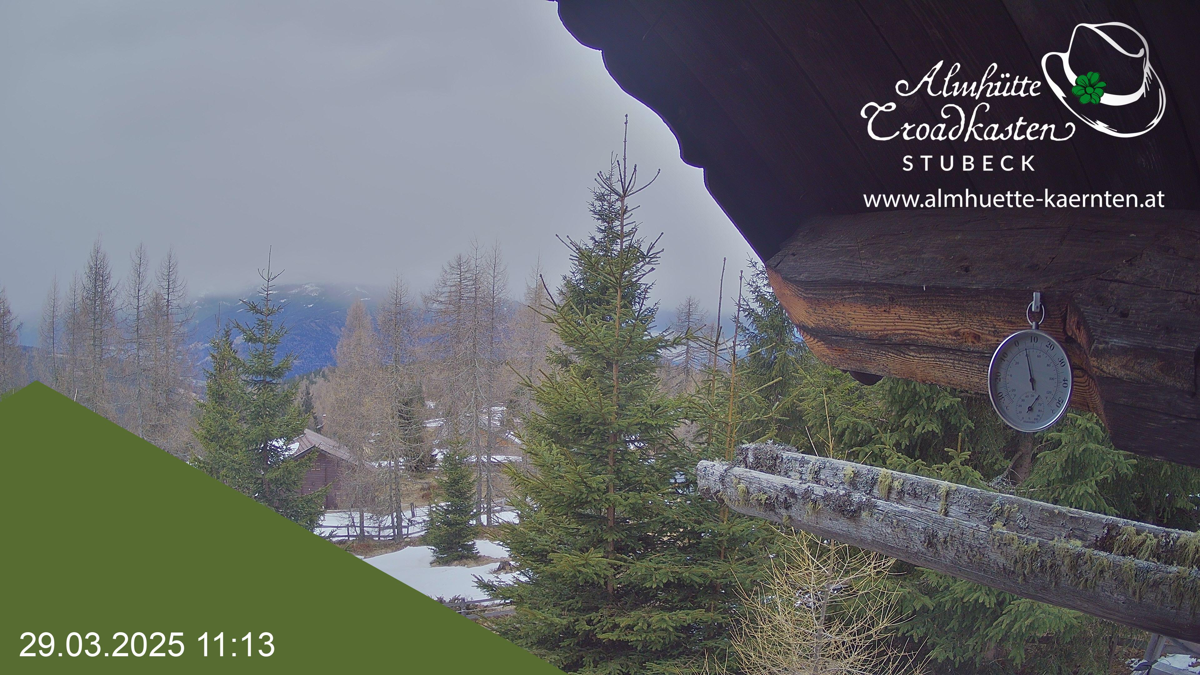 Webcam mit Blick von der Almhütte Troadkasten am Stubeck (Feriensiedlung Sonnalm-Stubeck, Oberkreuschlach, nördlich oberhalb von Gmünd in Kärnten) nach Südosten bis Süden; im Hintergrund (von links) Stileck, Kamplnock und Tschiernock (Gurktaler Alpen), dann (zurückgesetzt) ein Teil der Julischen Alpen (z. T. durch Bäume verdeckt), anschließend das Goldeck (Gailtaler Alpen; Latschurgruppe)